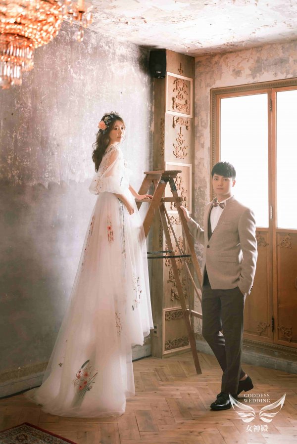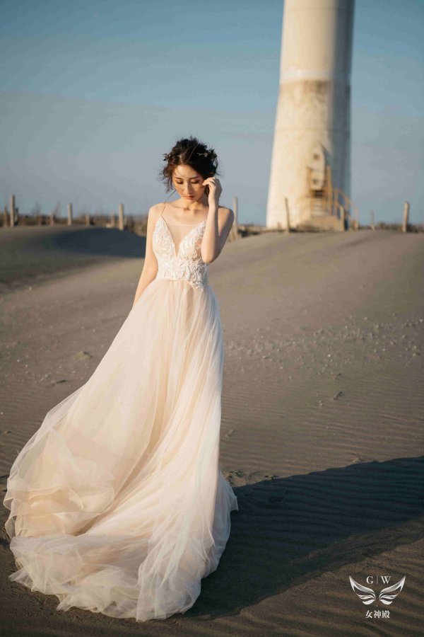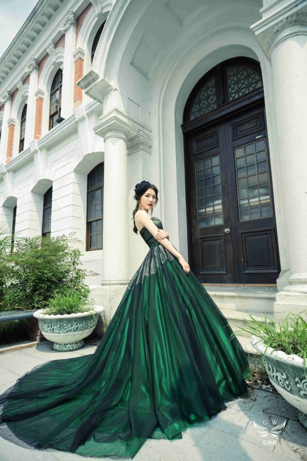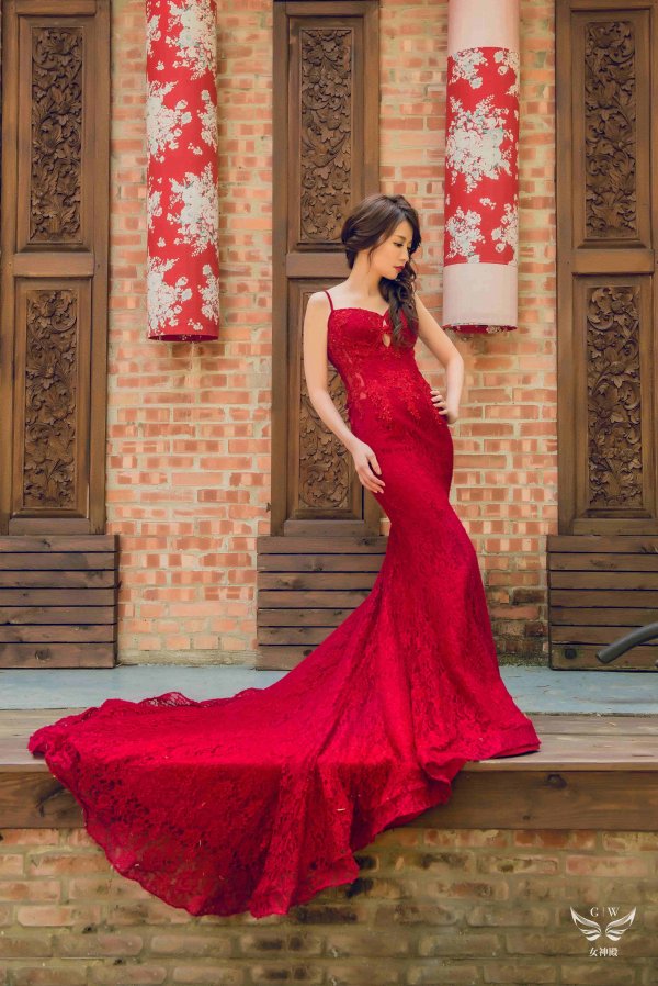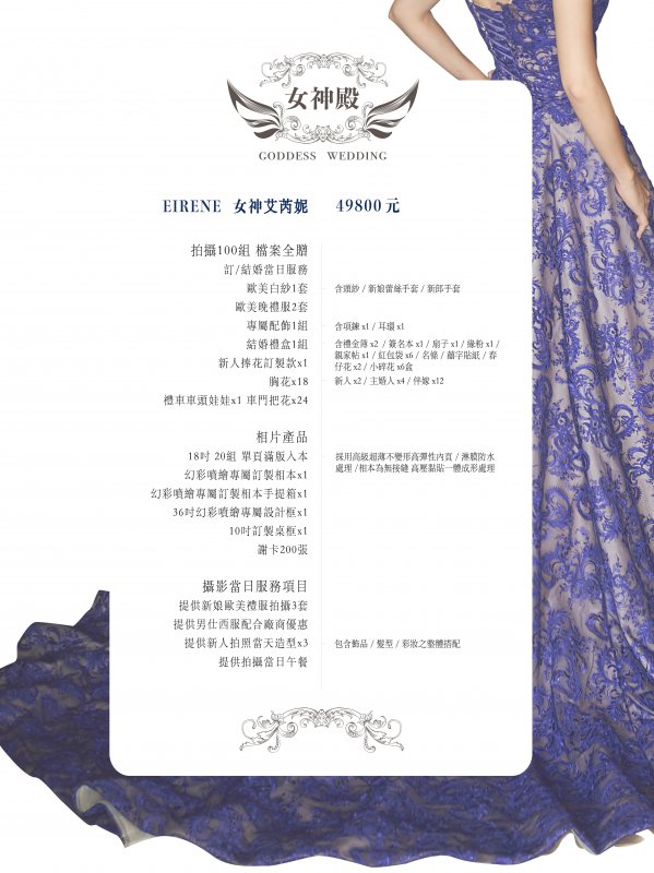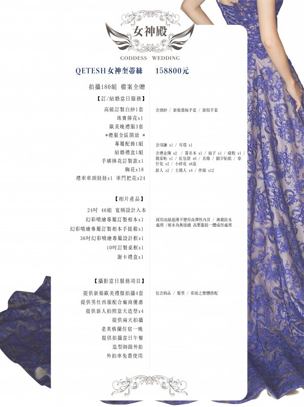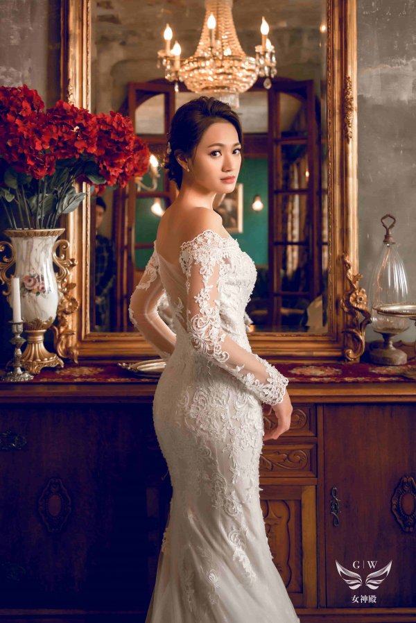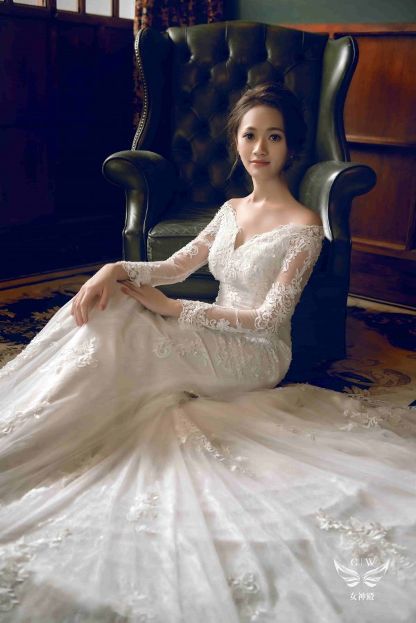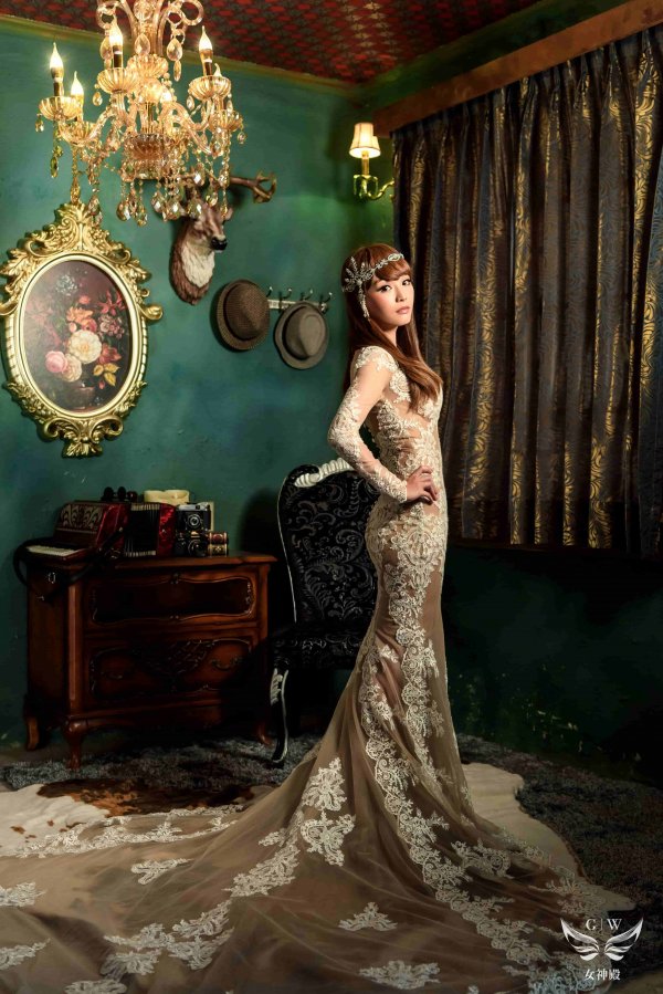 女神殿有屬於自己的禮服生產線,主打歐美風格立體剪裁,手工蕾絲,奢華釘珠 ,精緻華麗的大拖尾裙襬,並且設計2種穿搭風格可展現