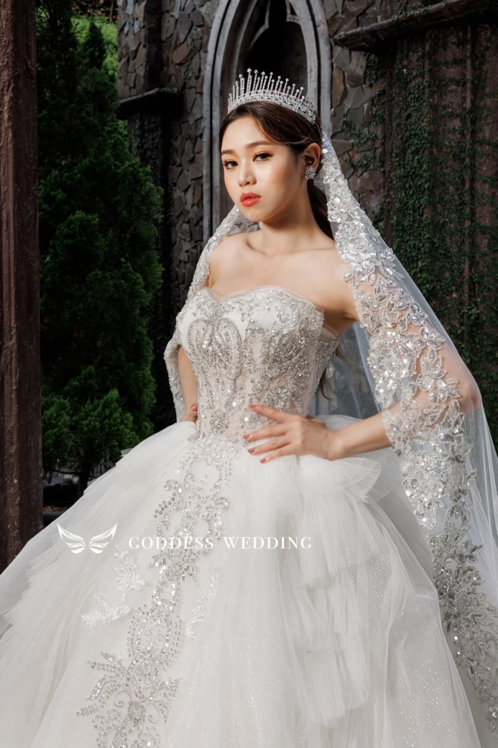 女神殿有屬於自己的禮服生產線,主打歐美風格立體剪裁,手工蕾絲,奢華釘珠 ,精緻華麗的大拖尾裙襬,並且設計多種穿搭風格可展現